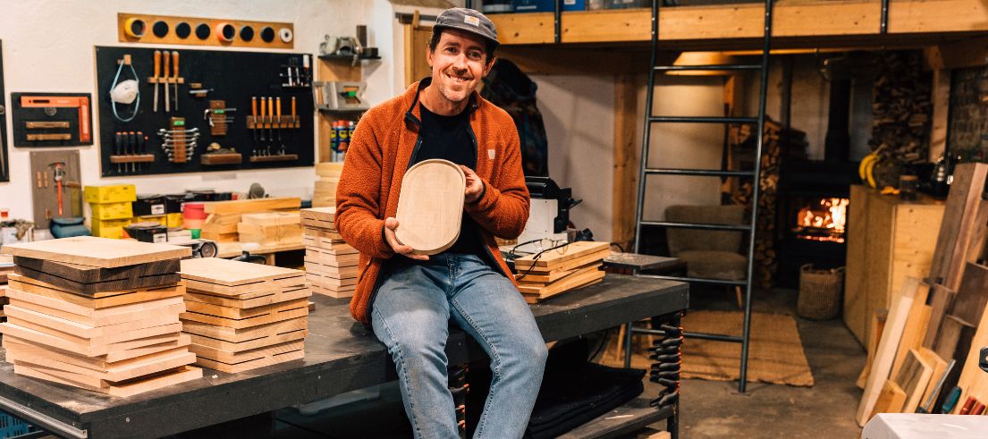 Wir besuchen Tom an einem verregneten Novembertag in Düsseldorf-Derendorf. Etwas abgelegen in einem Industrie-Hinterhof liegt seine Werkstatt. Außen mit Holzdielen vertäfelt und innen ausgestattet mit allem, was er für seine Holzarbeit benötigt. Es ist kalt und Tom schmeißt Holz in seinen Kamin, den er sich in einer gemütlichen Ecke der Werkstatt eingebaut hat.