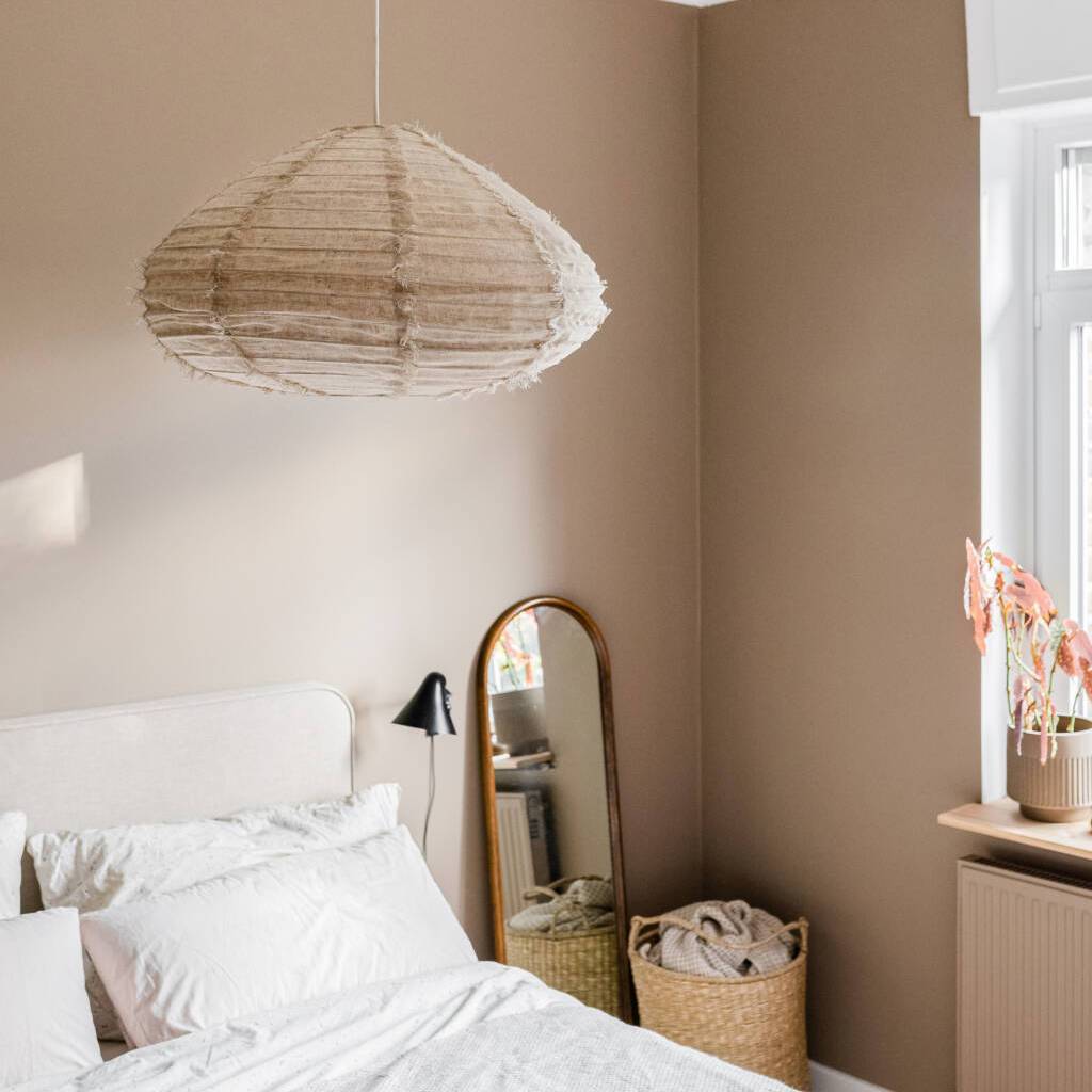 Der etwas dunklere Farbton der Leinenlampe Kanva in Natur setzt einen wohnlichen Akzent vor hellen Wänden.