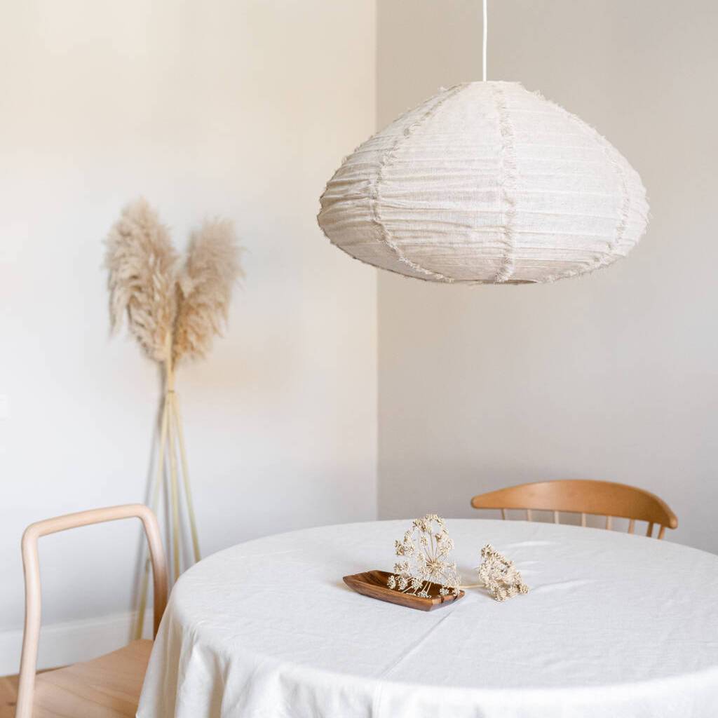Die Hängelampe wird als Lampenschirm ohne Leuchtmittel und Aufhängung geliefert. Die Lampe aus Leinen darf ausschließlich mit LED-Birnen verwendet werden, die keine Hitze entwickeln.