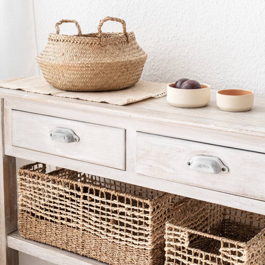 Regalkorb Warna ist unsere Empfehlung für Ordnung mit natürlichem Designanspruch in Wohn- und Arbeitsbereich. Kompakte Form, stabile Griffe und dezentes Muster. Im unteren Bereich fest geflochten aus kräftigem Seegras, oben leicht und warm im Ton durch Palmblatt. Jedes Stück entsteht in Handarbeit. Geflochten mit Zeit und Liebe für das Material.