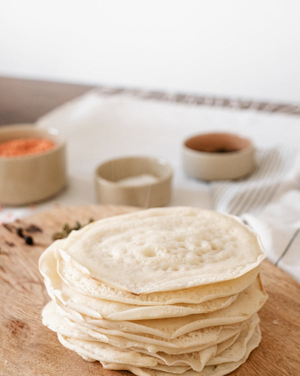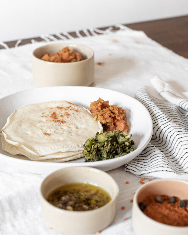 Hinweis: Das Injera erscheint in der Pfanne recht knusprig. Es wird aber soft, sobald man es aus der Pfanne nimmt.